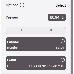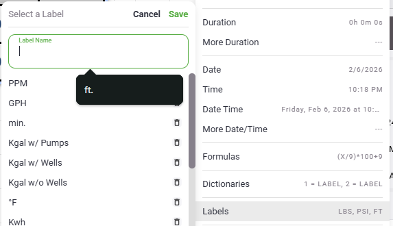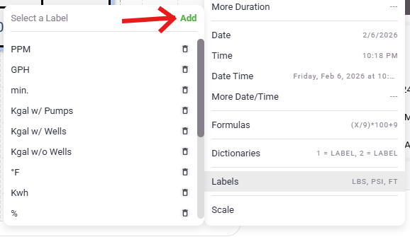 - Next, take a look at "Labels". This provides a way to display units of measurement after the data. Clicking this will present a list of any labels that have already been created in the project and also allow you to create new labels to use. Once a label is created be sure to select it in order to actually add it.