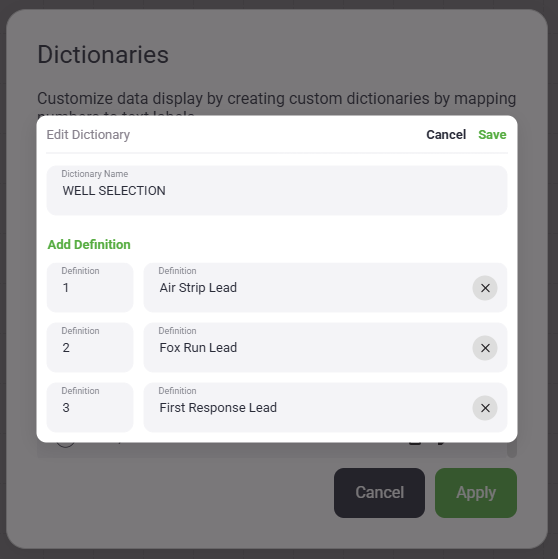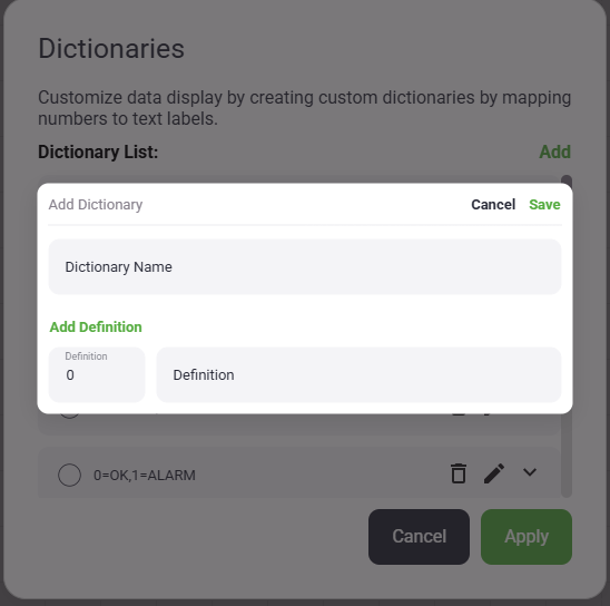 - When you click "Dictionary" a list will show any dictionaries that have already been setup in this project. To create a new dictionary click "Edit" in the Dictionary Header. This will present a pop-up with the dictionary creation tool. Give the dictionary a name that clearly shows what it will do. For example: "0=OFF,1=ON". Then, fill in the first definition and select "Add Definition" to add more.