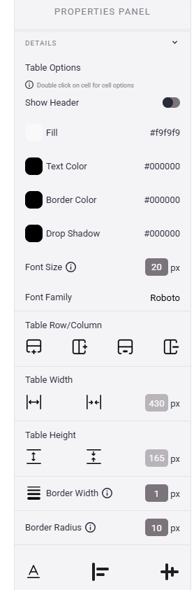 - Let's take a closer look at the table Properties Panel: