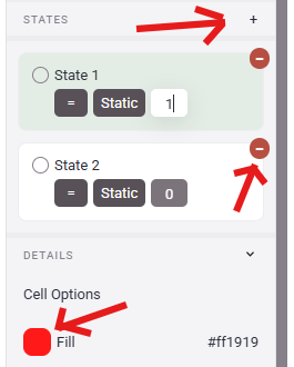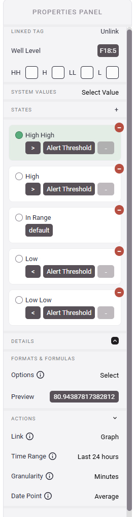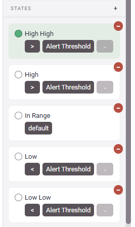 - The "States" section of the Properties Panel allows you to change the color of the text depending on the value currently being read from the tag. The default setting for states is a group of the 4 Alert Thresholds. These can be used to automatically create an Alert or change the displayed color if the value of the tag exceeds or drops below the set value (i.e. if a tank level drops below 5'). These states can be removed by clicking on the Red circle in the top right corner. Then new custom states can be added by clicking on the small plus sign in the States Header. A common use for this setting in tables is changing the color to Red when an alarm triggers.