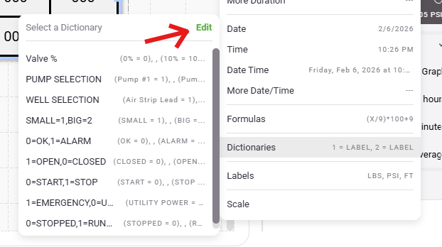 - Another important tool is "Dictionaries". This will allow you to completely change what is displayed. For example if you have a pump that gives you a value of "0" when it is off and "1" when it is on, you can use a dictionary to define replacement text to represent the value. In this example, when a 0 is present it will now display the word "Off" and when a 1 is present it will display the word "ON".