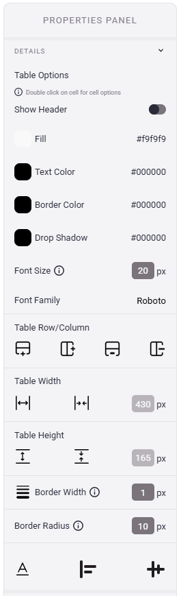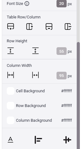 - The last row of options in the Table Property Panel has the options for Text Formatting (Bold, Italic, and Underline) and the Horizontal and Vertical Alignment options. These can also be set for individual cells.