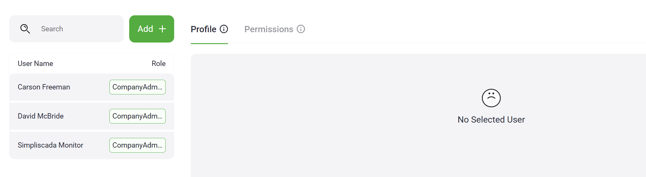 - The left-hand pane contains a search window (for quickly finding a user), an Add Button (for adding new users), and a list of existing users.