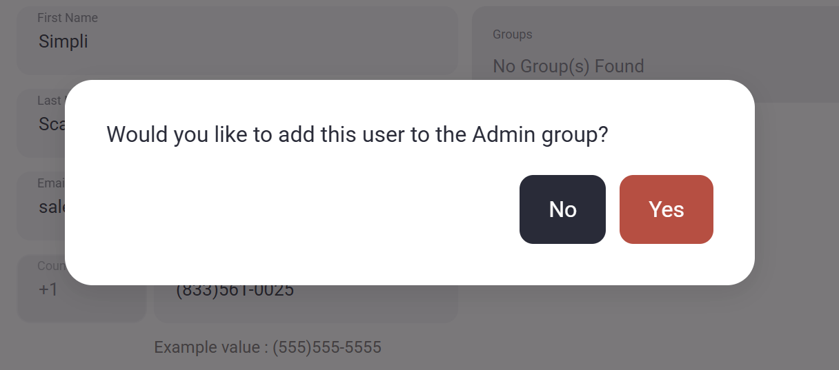 - A pop-up message will now ask if you wish to add the user to the group "Admin". Selecting yes will automatically place them in the admin group. If you wish to place them in a different group, select "No" and you will be able to add them to the group of your choice from the "Groups" section of the settings menu. See our knowledgebase article on groups for more info.