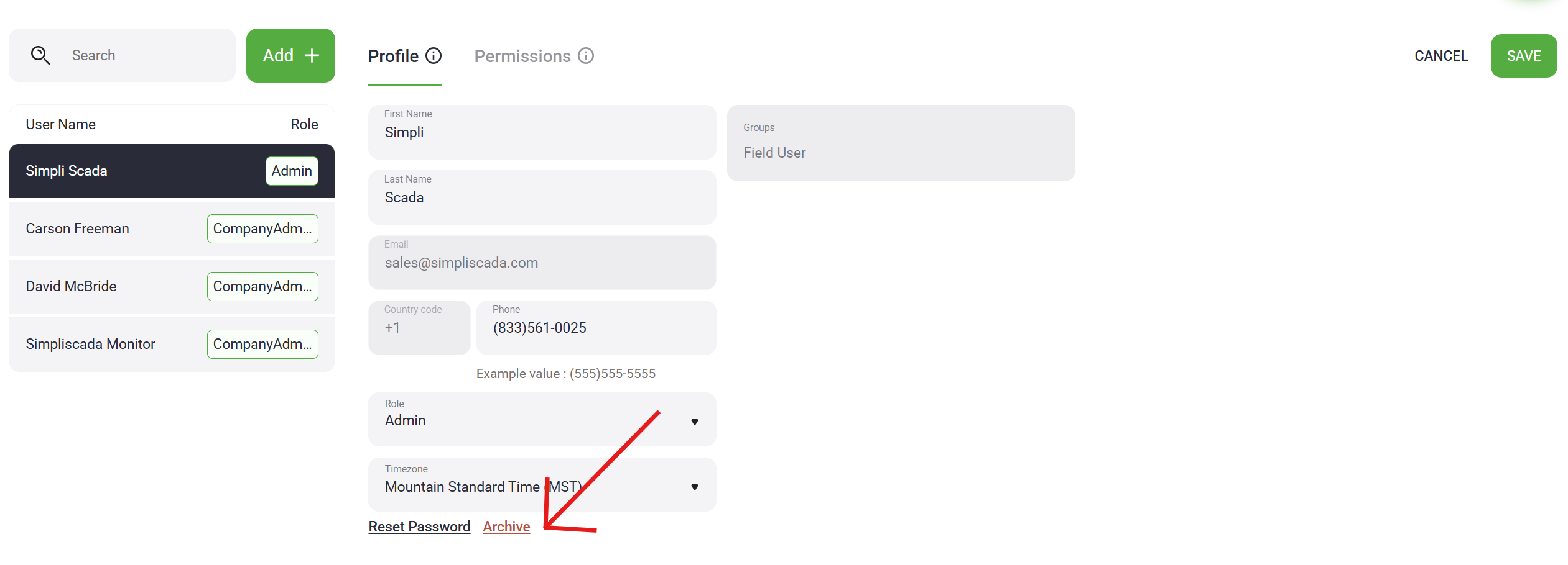 - To delete a user completely and remove them from the project: select the user to be deleted, click edit in the top-right of the page, the select the red text "Archive" at the bottom of the Profile. Once confirmed, the user will be deleted and removed from the project.