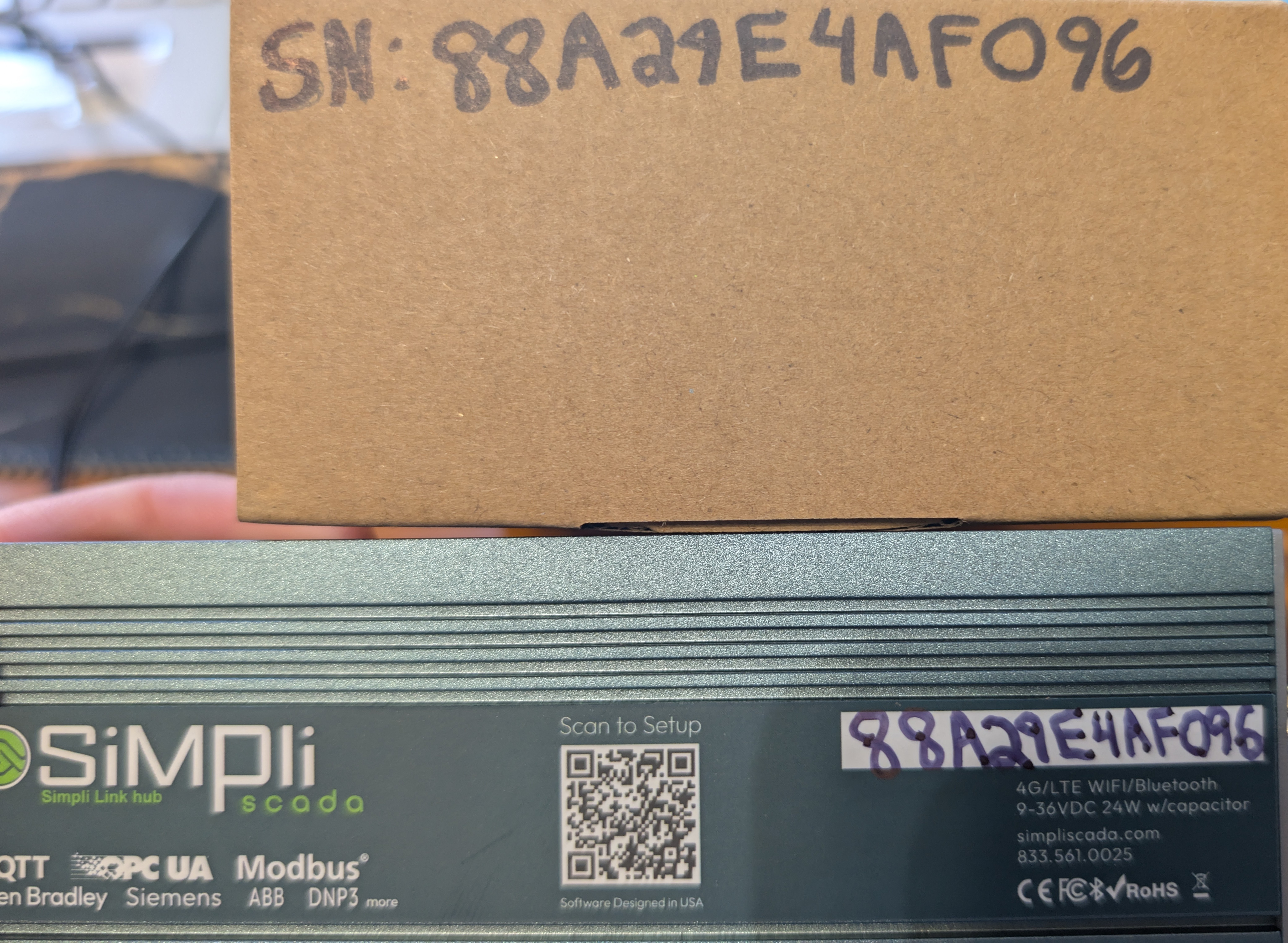 - Write down the serial # on the SimpliLink Hub and the outside of the box