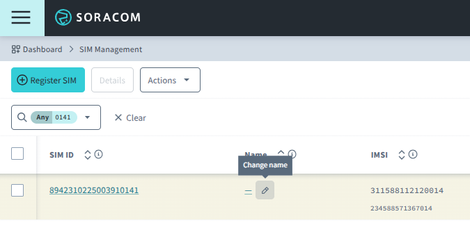 - Login to soracom. Search the last 4 digits of SIM card ICCID number. Update name to project name.