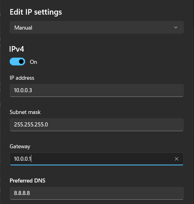 - Set ip address of network adapter to 10.0.0.3, subnet 255.255.255.0, gateway 10.0.0.1, dns 8.8.8.8