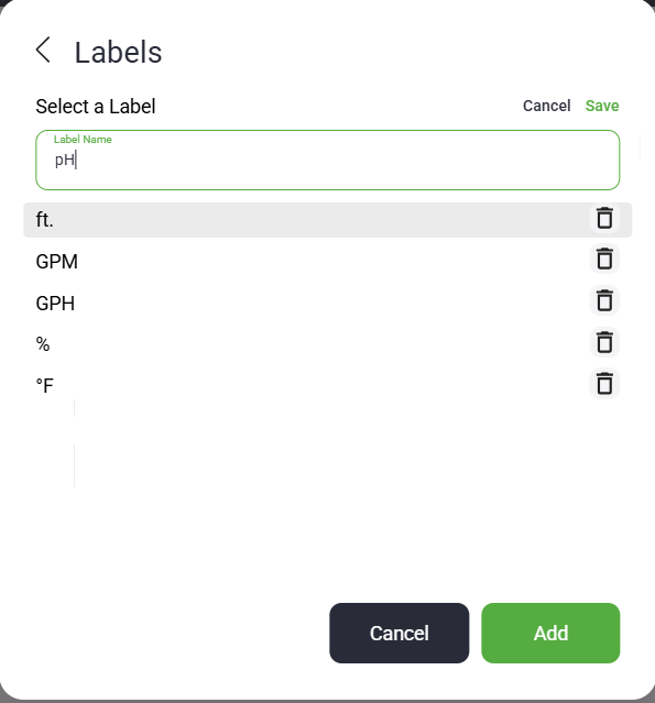 Enter the desired label (e.g., PSI, GPM, pH, Kgal)