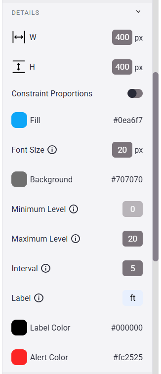 Level label display settings (Font Size, Min/Max Level, Interval, Label text, Label Color, Alert Color)