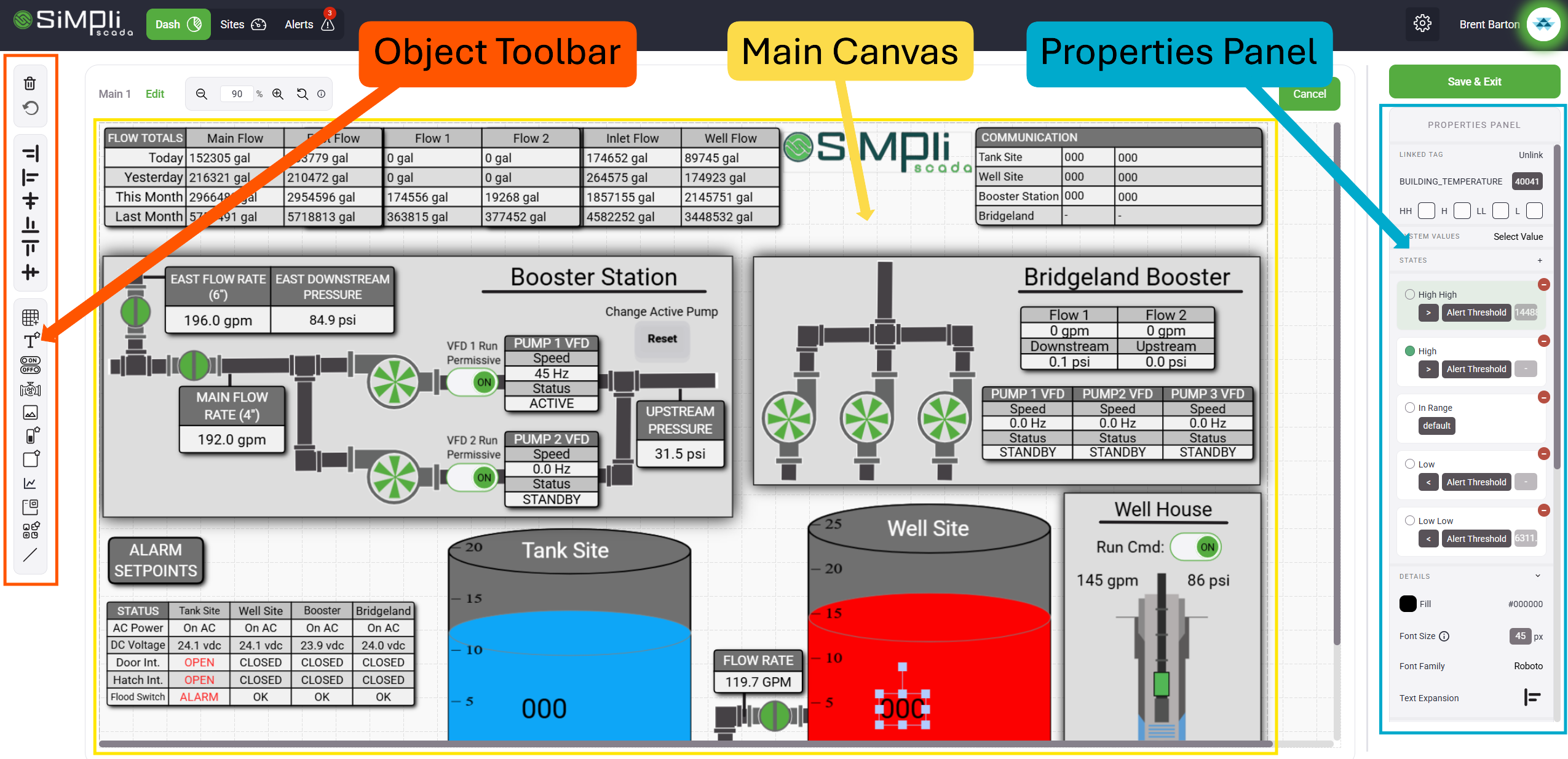 By combining the full range of visual objects with SimpliScada's extensive configuration options, you can build a powerful, interactive HMI that displays live data, responds to threshold conditions, and gives operators direct control!