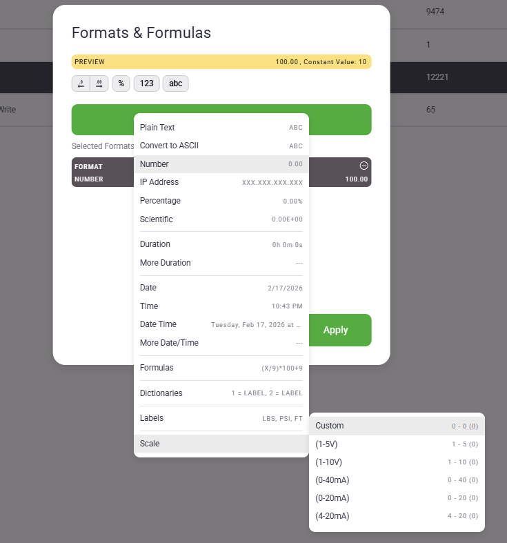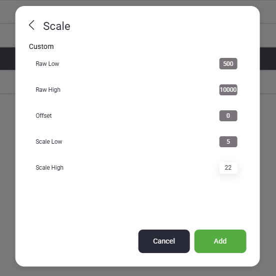 Using the example values we used above, we have filled in the "Raw Low", "Raw High", "Scale Low", and "Scale High" values. After entering the values used to define the scale, click the green "Add" button to close the "Scale" window.