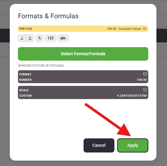 Click the green "Apply" button from the Formats & Formulas window to add it to the tag that is being editted.