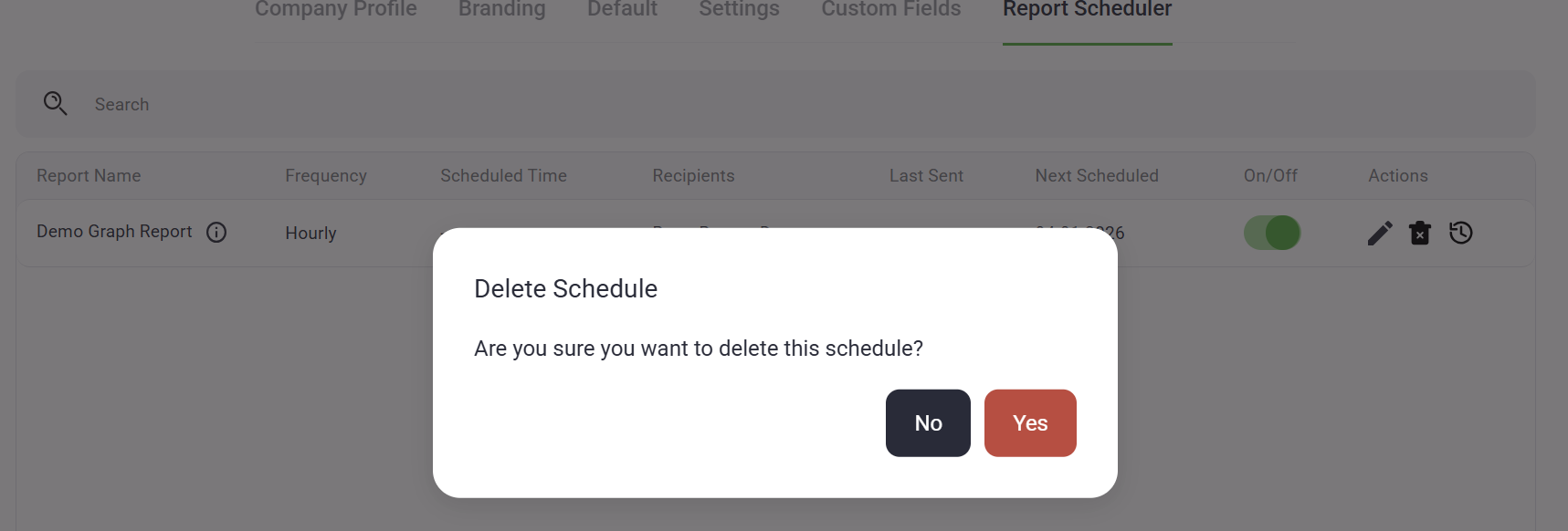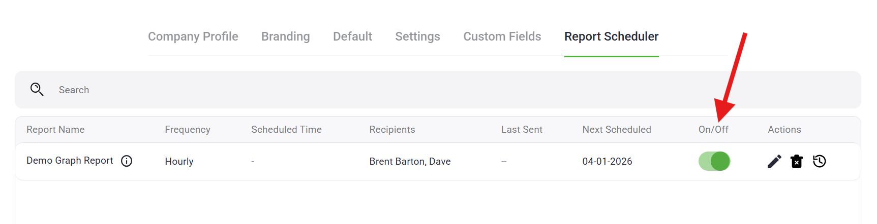 Use the toggle switch to enable or temporarily suspend a scheduled report.