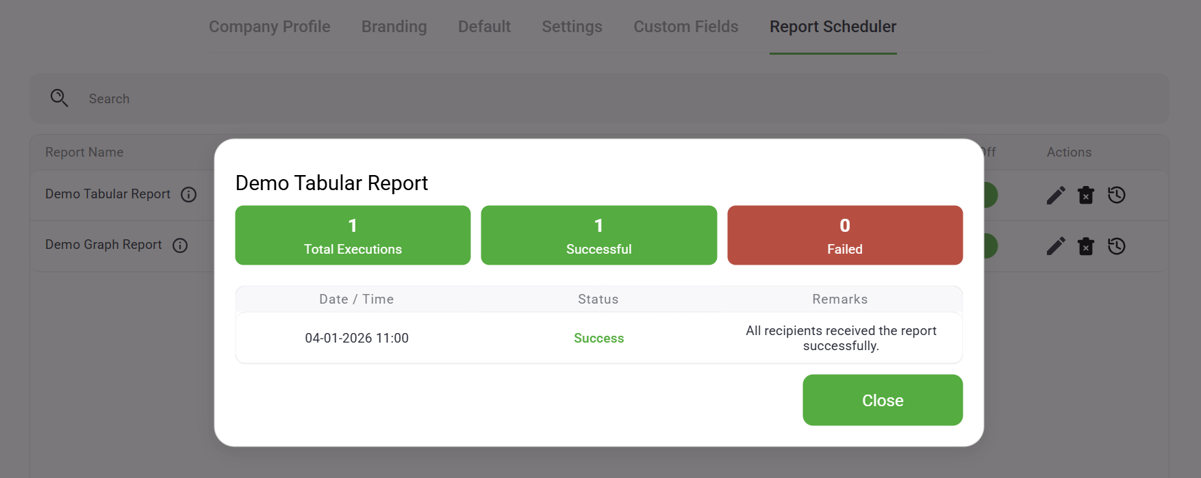 The history log includes information about when reports were sent and delivery status.