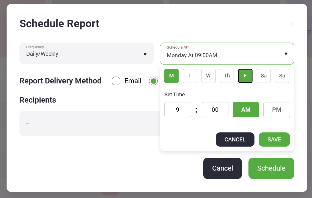 In the Schedule Report window, configure the following options: