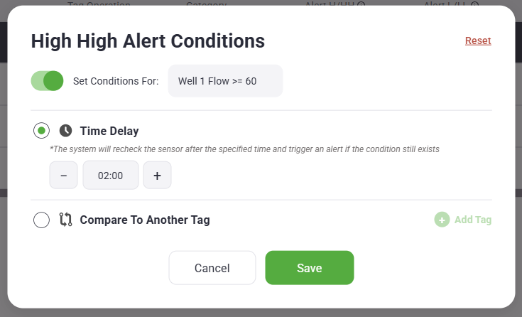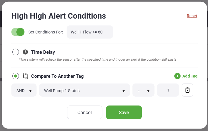 The Compare to Another Tag condition allows alerts to be triggered based on the state of a secondary tag.