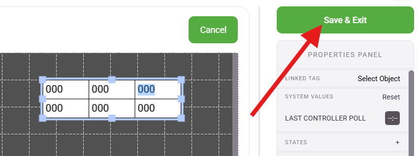 To view the values being populated in the fields, select the green "Save & Exit" icon in the top-left corner of the page. This will return you to the HMI view screen.