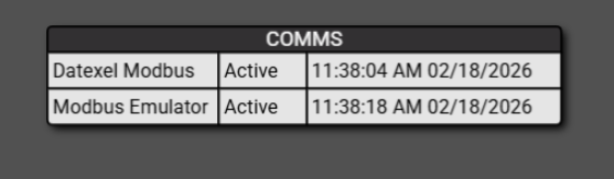 A communication table is a convenient place to view the current status of your controller without the need to leave the current HMI view. The table contains the name of each controller in the project, the current status (Active or Down), and the last Poll (most recent communication time stamp).