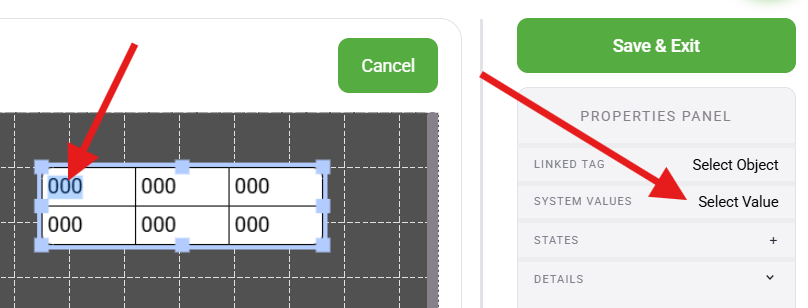 Once the table is in your canvas, double-click on the first field to select it. This will open a properties panel on the right-hand side of the canvas. Click on the system value's "Select Value" to open a fly-out menu with the available controller information options.