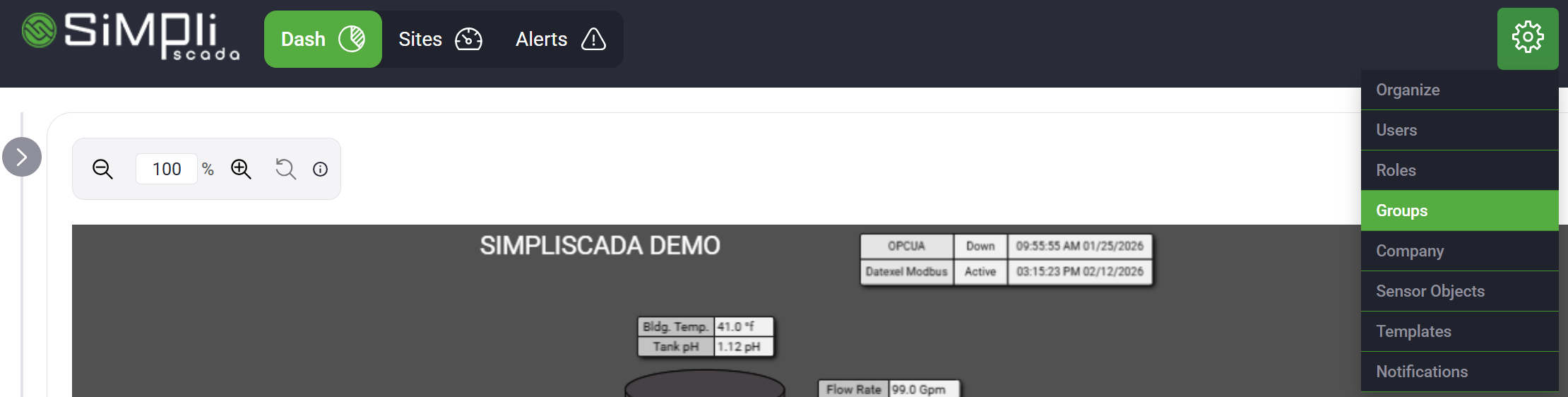 - To access Group settings, first hover over the green "Gear Icon" in the top-right of the main page and select "Groups".