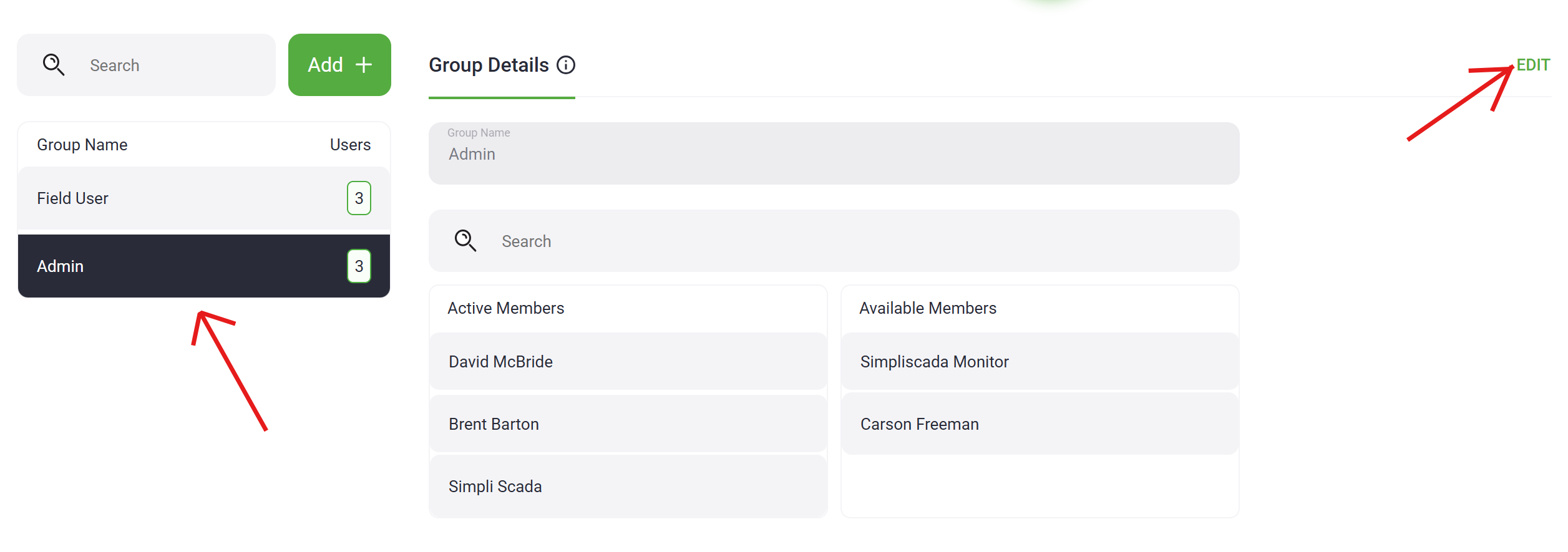- You can modify existing group Active Members by selecting the group and clicking the green "Edit" button in the top right.