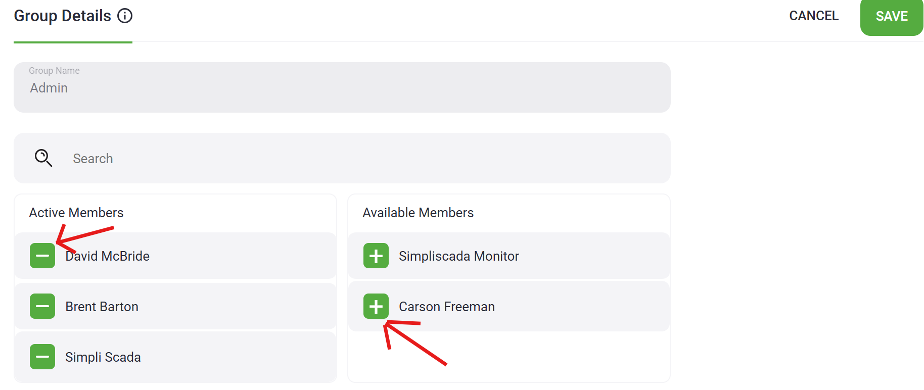 - To remove an Active Member of a group, click on the green "-" symbol next to their name. To add an Available Member, click on the green "+" symbol next to there name. Be sure to save your changes when you are done.