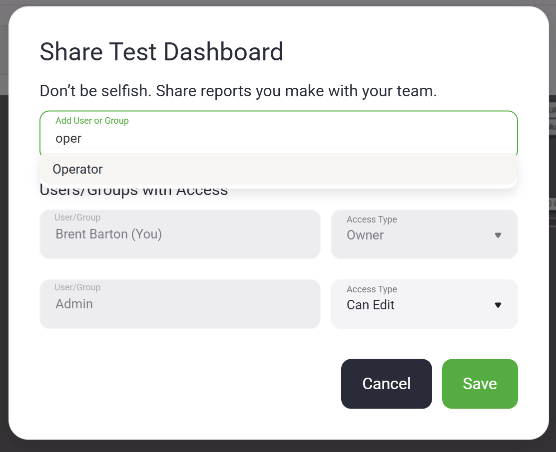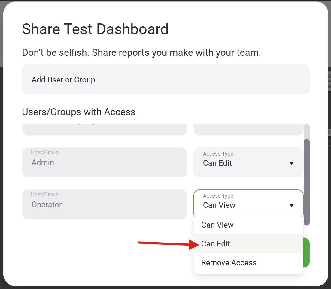 - Type in the name of the user or group that you wish to give access to. You will then be able to select an access type: "Can View" allows users to view the HMI/Report, "Can Edit" allows users to make changes to the HMI/Report, and "Remove Access" will revoke their access to the HMI/Report. Save your changes when you are done by clicking the green "Save" button.