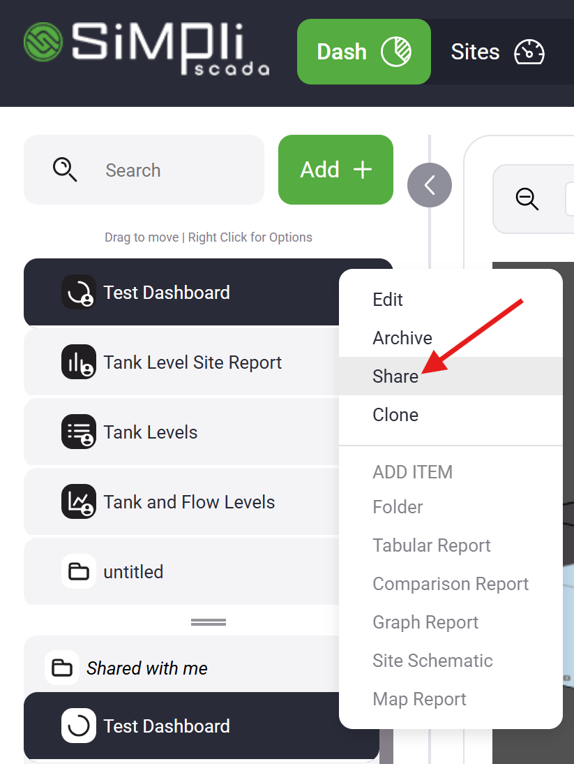 - From the "Dash" page, right-click on the report that you wish to grant other users access to. Then select share from the pop-up menu.