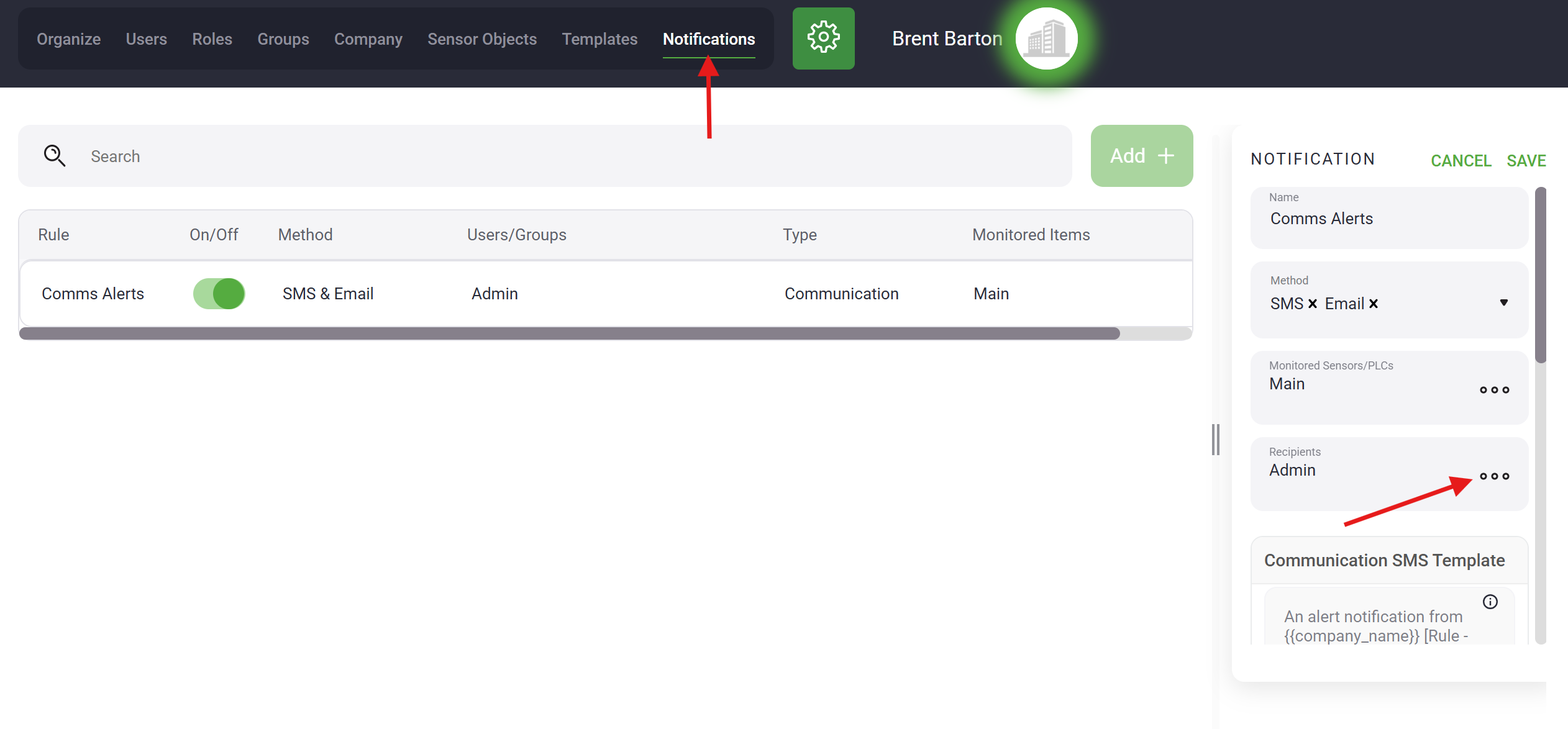 - Select "Notifications" from the green gear icon at the top of the page. Then select the Notification rule that you wish to assign users to receive. Click "Edit" at the top-right of the notification pane. Then click on the ellipses in the "Recipients" area.