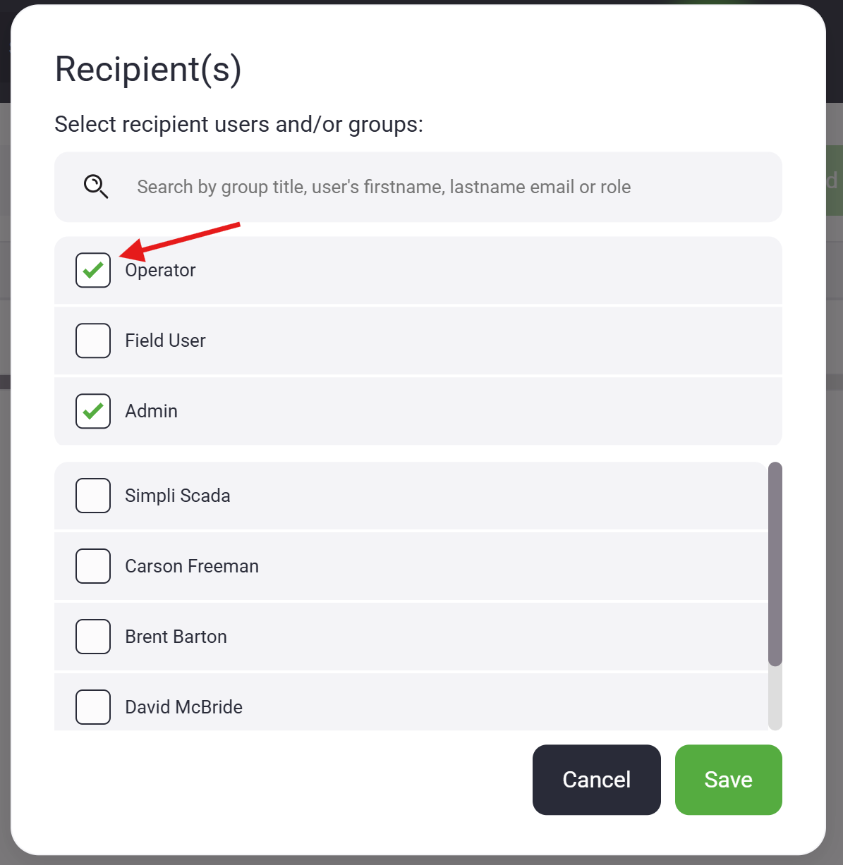 - Simply select the check-box next to the groups you wish to add to automatically add any users within that group. Click the green "Save" button at the bottom when you are done selecting users/groups. Also, be sure to click the green "Save" icon at the top-right of the "Notification" pane to save these changes to the notification rule you are updating.