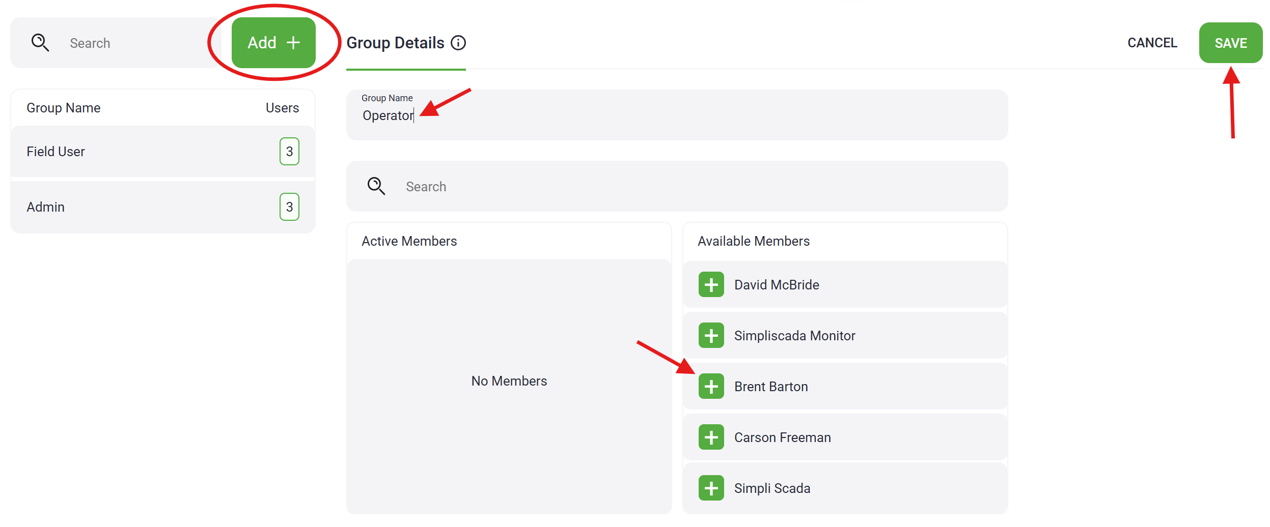 - To create a new group, click on the green "Add +" button in the top-left of the window. Next, type in a name for your group in the Group Name field. Finally, use the "+" icon next to each desired user to add them to your new group. Save your changes with the green "Save" icon.